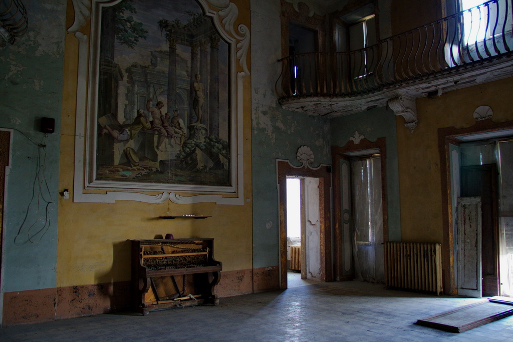 Главный зал виллы с фортепиано и большой картиной. Интересно что картина на противоположной стене почти не сохранилась.