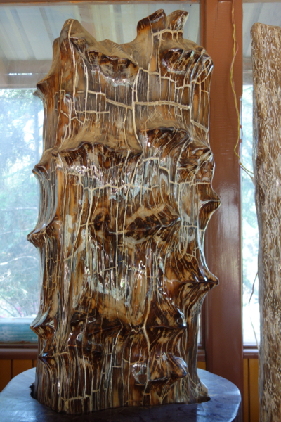 Там были куски наполовину отполированные, гладкие и блестящие и разноцветные. А вторая неотполированая половина была похожа просто на кусок дерева, там даже осталась структура дерева - его прожилки и в них кристалики минералов.