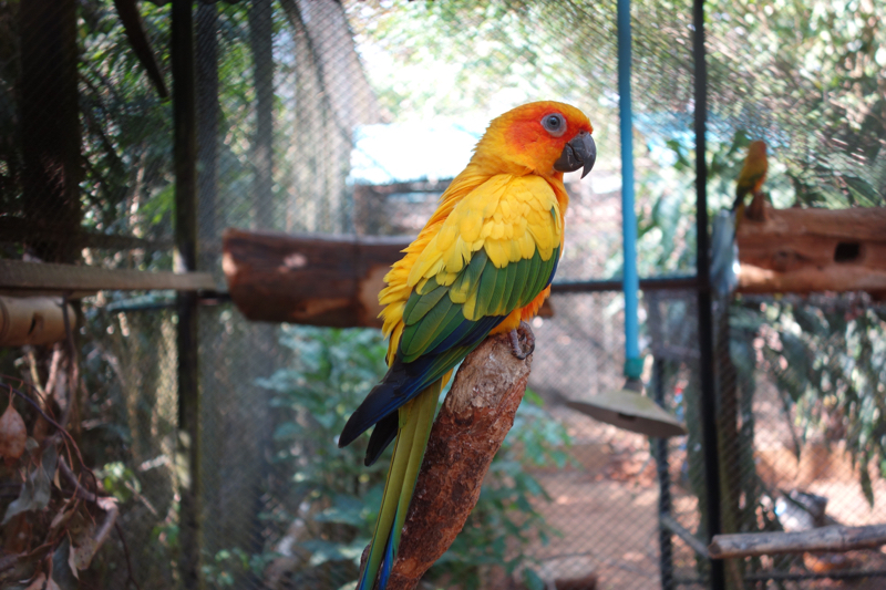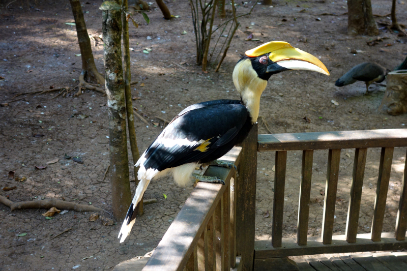 Там были красивые разноцветные попугаи в клетках, говорящая птица которую мы уже встречали в Таиланде. А еще там было много павлинов и такая удивительная птица которая ела дерево. У нее были смешные волохатые лапки и вся она была очень комичная, с огромным клювом. Она смешно бегала по забору и перепрыгивала с ветки на ветку - птицы там почти на свободе, если не учитывать сетку над головой.