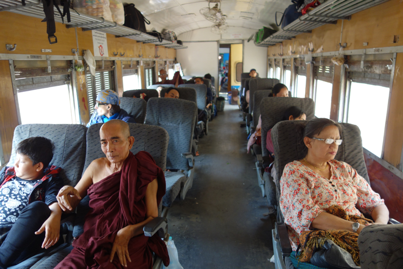 Кресла в этом странном вагоне крутились на 360 градусов - так что вагоновожатый повернул наши сиденья так, чтобы мы не сидели лицом к лицу к мьянмарцам. Он суетился, бегал за молотком и потом за отверткой - выглядело всё это весьма забавно. Кресла были удобные, мягкие, хоть и слегка покачивались - видимо из-за того что их крутят туда-сюда.