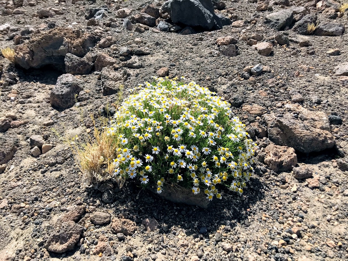 Мы прошли через долину усеянную огромными черными булыжниками из лавы, они называются “яйца Тейде”. Сформировались они благодаря тому что уже застывший кусок лавы скатывался по крутому склону вулкана по еще не застывшей лаве и образовались такие огромные лавовые снежки.