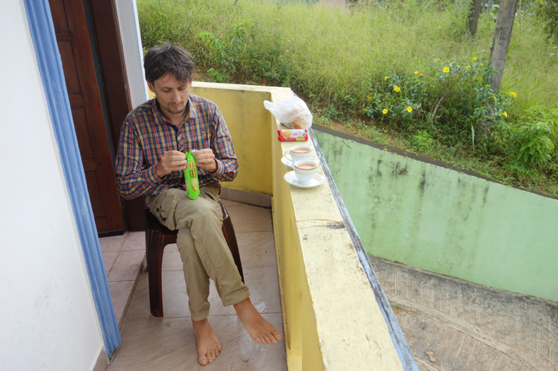 Было около 16 часов и мы думали съездить в центр города чтобы найти еду. Но парень который нас поселил сказал что сегодня на Шри ланке праздник и все рестораны откроются после 18. Так что пока мы пьем чай на нашем балконе.