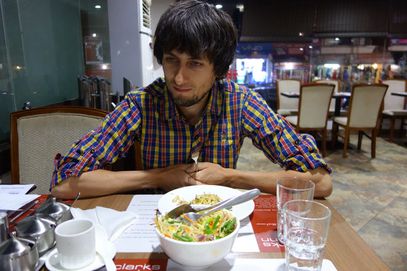 Вечером выбрались поужинать. Я прочитала про ресторан в каком-то козырном отеле, интересно было на него посмотреть. Ресторан оказался очень шикарным по меркам Индии. Официанты там были вышколенные, посуда фарфоровая (а в основном либо нержавейка, либо, если покруче кафе, то пластиковые тарелки), цены больше, чем мы видели за все наше путешествие, но не намного и мы решили остаться и поесть. Была надежда на то, что в таком месте они непременно поймут, что мы хотим не острое.