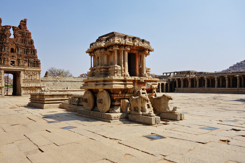 Кроме колесницы на территории расположены еще несколько храмов с красивыми каменными фигурами и резными колоннами, но они очень похожи на те что мы уже видели в Хампи и за бесплатно.