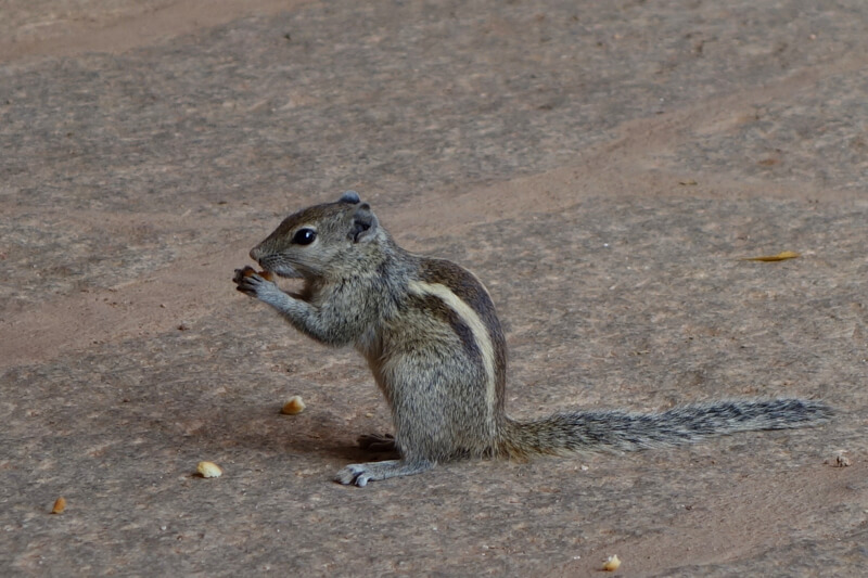К этому времени мы уже изрядно подустали. Сели отдохнуть в тени с видом на слоновьи стойла. Волчий кормил пальмовых белок печеньем.